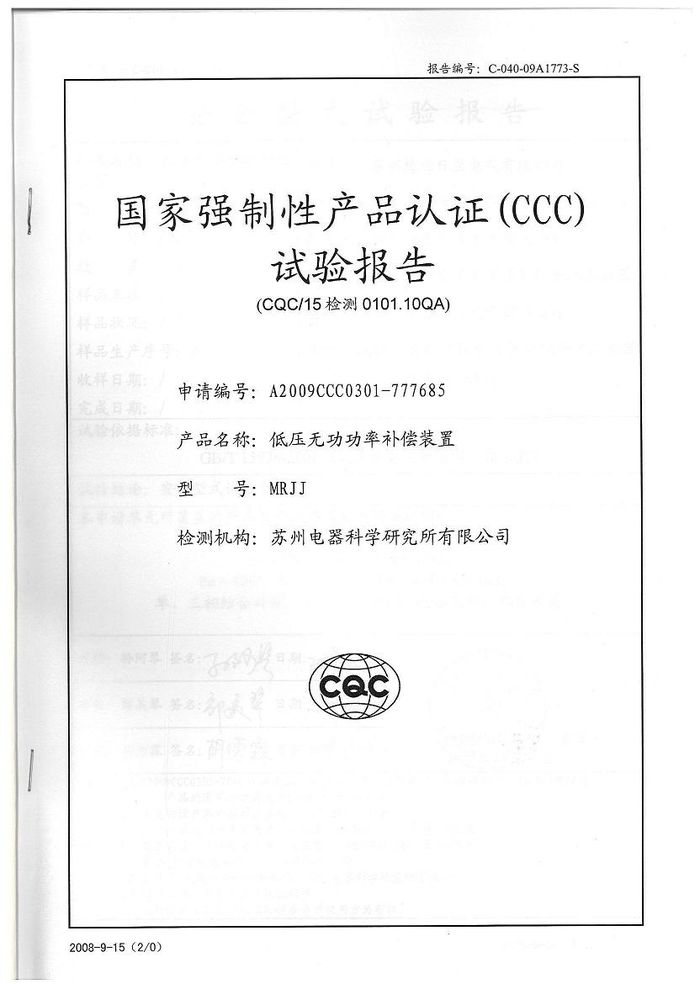 (成套)MRJJ無功柜資質(zhì)證書