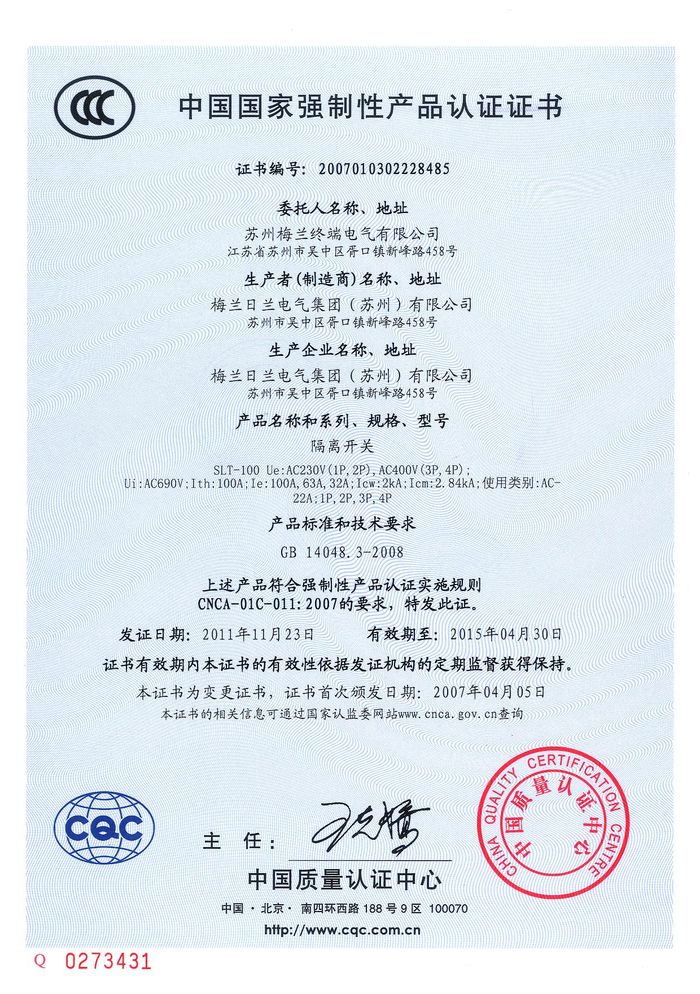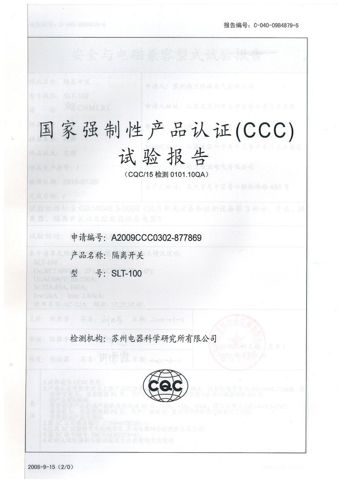 SLT-100隔離開關(guān)資質(zhì)證書
