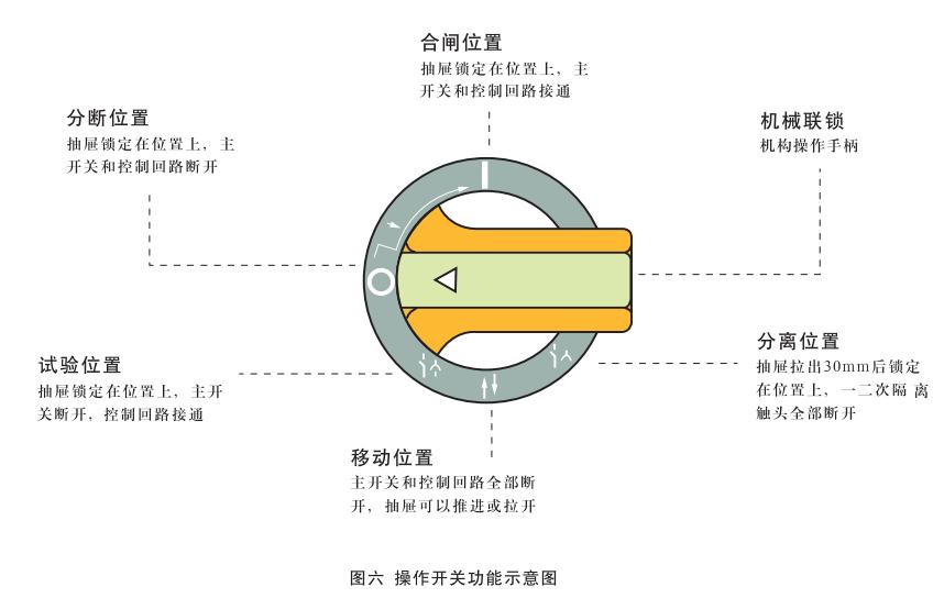 抽屜插入后,將手柄順時針方向轉(zhuǎn)動時,首先到達“試驗位置”(↓),此時機構(gòu)將外部電源引入控制回路,用戶通過面板上的安全電器(假如有的話)對電路進行試操作,以確認其是否符合要求,由于主開關(guān)尚處于斷開狀態(tài),因此一次回路處于無電狀態(tài),即使操作結(jié)果與要求不符也不會損壞設(shè)備,繼續(xù)順時針方向轉(zhuǎn)動到手柄處于水平位置時,即“分斷位置”(0)。此時一次和二次回路均處于無電狀態(tài),沿順時針方向繼續(xù)旋轉(zhuǎn)90°則手柄轉(zhuǎn)到“合閘位置”(I),見圖六。