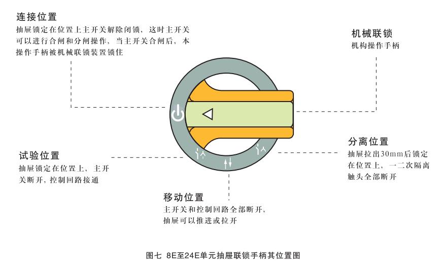 8E/4, 8E/2單元抽屜的操作:這種操作是通過對抽屜面板上的手柄進行操作實現(xiàn)的,見圖六。只有當手柄上的白箭頭指示“移動位置”(↑↓)時,抽屜方可抽出或插入,在其它任何位置上,抽屜都應(yīng)被鎖定,因此不可能對抽屜實施抽出或插入操作。此時不可硬拉或硬拖以免損壞機械聯(lián)鎖機構(gòu),抽屜從連接位置抽出30mm(此時手中工件一輕微震頗感)時將操作手柄向逆時針方向轉(zhuǎn)過45°,抽屜即被鎖定在“分離位置”(↑↓)此時一次和二次隔離插件均己脫離電網(wǎng)并形成安全間隔。