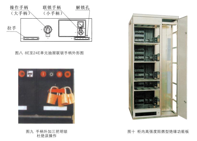 8E, 16〔和24E抽屜的操作:這種操作稍不同于8E14和8E/2單元抽屜的操作,由輪番操作一大一小二個手柄來完成。小手柄與8E/4,8E/2抽屜的操作手柄外形相同,作機械聯(lián)鎖用,位于抽屜面板右下方,它共有四個位置:“移動位置”(↑↓)、“分離位置”(↑↓)、“試驗位置”(↑↓)和“連接位置”(↓),見圖七、圖八。