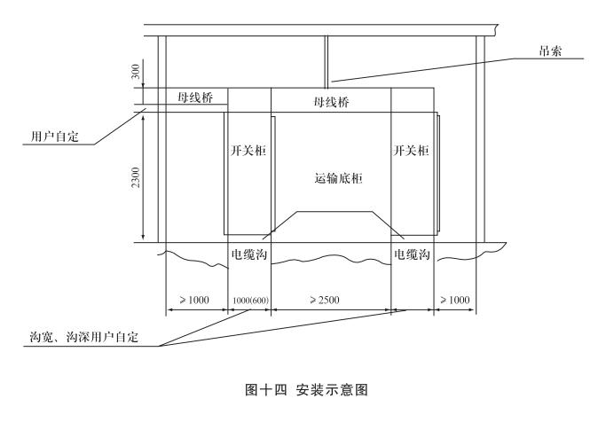 安裝:開關(guān)柜就位。找準位置,按圖十一所示進行焊接,焊接節(jié)柜和焊長由用戶確定,產(chǎn)品安裝與配電室的相對位置參考圖十二,其中吊索是否安裝由用戶確定,制造商提供的原則是:當母線橋的長度大于3米時應(yīng)考慮安裝吊索。但是,當母線橋的電流大于或等于2500A時,其長度為2.5米時也應(yīng)安裝吊索。